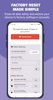 To perform a secure, full factory reset and to lock the device when required, Android mandates elevated management privileges. This app asks for Device Administrator only for the limited, stated purposes below:
